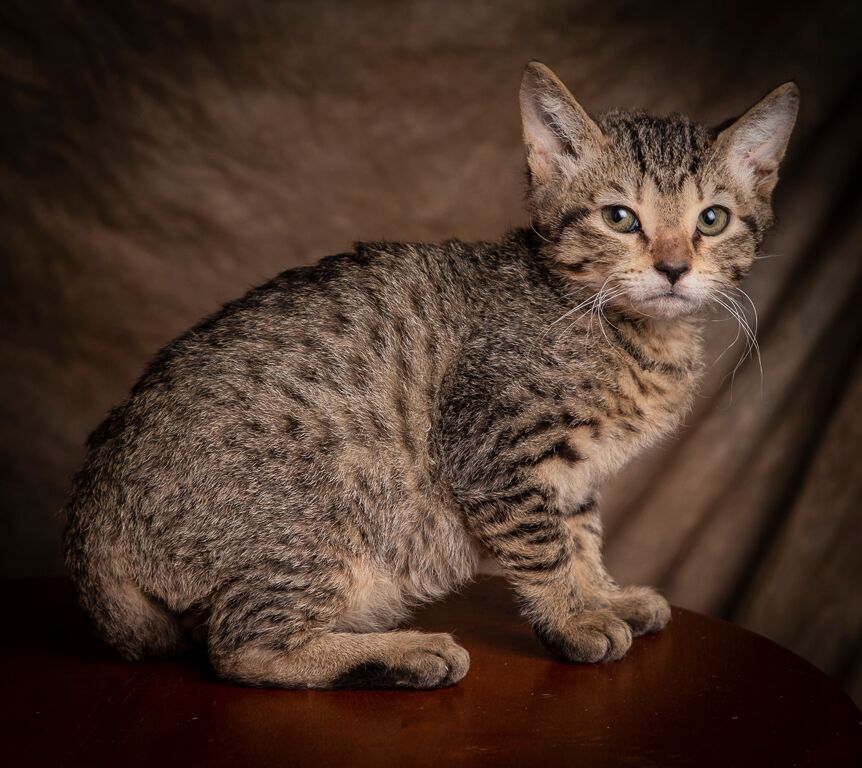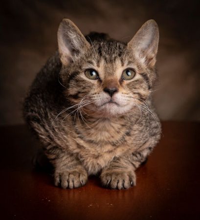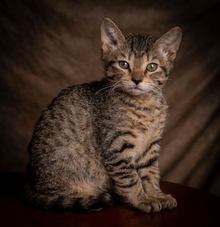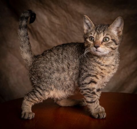 Hazel is a female tiger kitten born approximately end of April 2018.  She is very unique looking and thought to be part Rex cat. She has a thick curly coat and curly whiskers characteristic of the Rex breed. Hazel is a petite little girl with a super sweet outgoing personality. She gets along well with dogs, cats and kids. She’ll make the purrfect family pet.